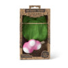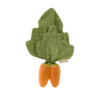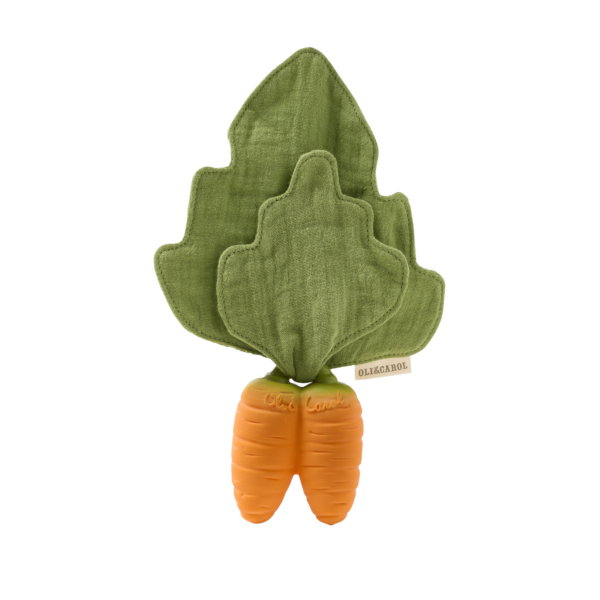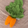 Urocze połączenie gryzaka i przytulanki w kształcie marchewki lub rzodkiewki.