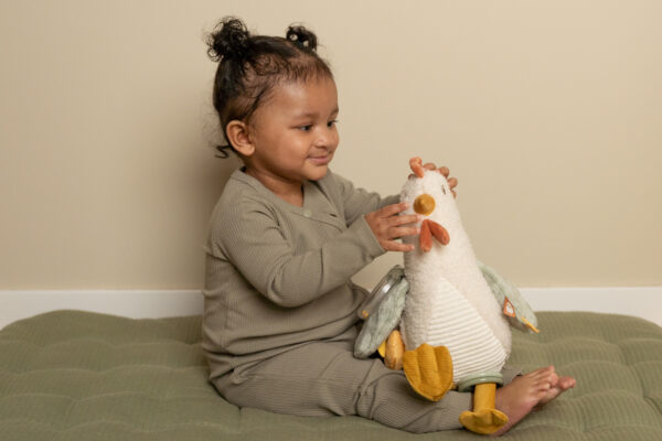 Przytulanka aktywizująca Little Farm 25 cm od Little Dutch. Ten uroczy kurczaczek wykonany jest z mięciutkiego, przyjemnego pluszu. Posiada wiele atrakcji do odkrycia. Znajdziecie tu lusterko, grzechotkę, gryzak oraz różne metki – tak uwielbiane przez maluchy! Jest zaprojektowany w taki sposób, by pomagać ćwiczyć umiejętności motoryczne Twojego maluszka w trakcie zabawy. Świetna, rozwijająca zabawa gwarantowana! Stanowi doskonałe uzupełnienie do pozostałych produktów z kolekcji Little Farm. Wspaniały pomysł na prezent.