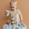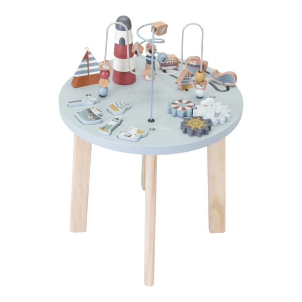 Stolik edukacyjny Sailors Bay FSC Little Dutch to fantastyczna zabawka edukacyjna i sensoryczna dedykowana dzieciom powyżej pierwszego roku życia. Stolik wykonany jest z drewna z certyfikatem FSC i pokryty bezpiecznymi farbami na bazie wody. Odkryj wszystkie atrakcje, które oferuje ten stół. Pomóż mewom przenieść koraliki po spirali, zbuduj latarnię morską lub uroczą żaglówkę, ułóż układankę z bohaterami z kolekcji Sailors Bay, zakręć kołami i przepłyń ocean małymi łódkami.